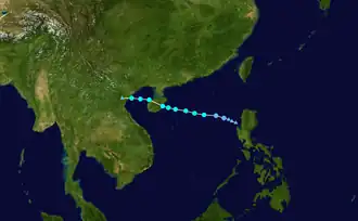 On October 11, 2020, the Japan Meteorological Agency (JMA) began tracking a tropical depression off the west coast of Luzon.[2] The PAGASA declared the system as a tropical depression at 12:00 UTC, and since the storm formed inside of the Philippine Area of Responsibility (PAR) the agency named the system Nika.[3] On the same day at 21:00, the Joint Typhoon Warning Center began issuing warnings on the system.[4] On October 12, the system was declared a tropical storm by the JMA, and was named Nangka.[5] At 9:00, the system left the PAR and the PAGASA issued its final bulletin on the system.[6] At 19:20 CST (11:20 UTC) on October 13, Nangka made landfall over Qionghai, Hainan.[7] The system continued tracking westward, returning to open water, before making a second landfall in Ninh Bình, Vietnam on October 14. As the system tracked further inland, it dissipated over Laos on the same day.[8][9]