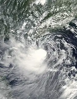 On July 10, PAGASA issued their final advisory on Tropical Depression Gorio as it moved out of their area of responsibility.[7] Hampered by an unfavorable upper-level environment, the depression barely intensified into a tropical storm early on July 11.[8] Upon becoming a tropical storm, the JMA named the system Soudelor reporting peak winds of 65 km/h, (40 mph).[6][9] Later that day the JTWC reported that Soudelor had weakened into a depression;[10] however they re-upgraded it to a tropical storm as it moved closer to Hainan Province.[11] Shortly before landfall in Leizhou Peninsula, China, the JTWC downgraded the storm to a tropical depression.[12] After moving back over water in the Gulf of Tonkin, the JTWC issued their final advisory on the depression.[13] The JMA, however, continued to monitor Soudelor until it made landfall near Fangchenggang, China several hours later.[14]