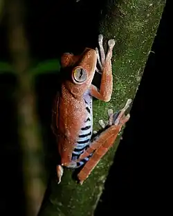 Troschel's treefrog (Boana calcarata), also known as the blue-flanked treefrog[2] or the convict treefrog,[3] is a species of frog in the family Hylidae.[2] It is found in most parts of the Amazon Basin including Suriname.[1][2][4] Colombian, Guianan and Venezuelan records need confirmation.[2][5]