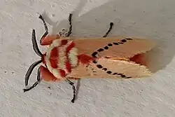 The thorax of Trosia nigropunctigera is densely clad with short hairs and is white or straw-coloured with six distinct red spots. The forewings are white or pale straw colour with a single row of black spots running across parallel with the rear margin. The head, abdomen, legs, and forewings are red.[3]