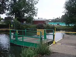 Teddington Lock's Weir is a large structure on the same side of the river by Teddington Studios and the Lensbury Club[n 1], which is 450 m (490 yd) downstream.[1] From the Thames Path crossing across the Lock in the north Ham is accessible.[2] From the Teddington riverside by the island, stations of Hampton Wick and Teddington are 1.4 kilometres (0.87 mi) and 1.9 kilometres (1.2 mi) respectively by foot or road and therefore the centre of Hampton Wick is closer to the island than any other settlement.[1]