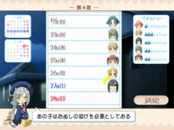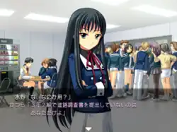 The gameplay in True Tears requires little player interaction as much time is spent on reading the text that appears on the lower portion of the screen, representing either dialogue between characters, or the inner thoughts of the protagonist. Before the beginning of every week in the game's storyline, the player is given the option to plan a schedule, and is allowed to pick and view any three days of the given week.[2] Different events occur depending on the days that the player chooses. Every so often, the player will come to a "decision point" where he or she is given the chance to choose from options that are displayed on the screen, typically two to three at a time. Depending on which choice the player makes, the "tear points" of the heroine associated with the events of the day would either increase, decrease, or remains the same. "Tear points" act as a system notifying the player how well he or she is treating a certain character. If a character's tear points exceed the maximum amount of eight, her ending is rendered inaccessible during that specific playthrough. There are multiple plot lines that the player will have the chance to experience. To view all of the plot lines, the player will need to replay the game multiple times and make different schedules and choices during decision points to progress the plot in an alternate direction.