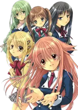 Other characters include Hikari Ogasawara (小笠原 光里, Ogasawara Hikari; Voiced by: Ami Koshimizu), a friend of Yuzuko's, and Mako Momose (百瀬 真子, Momose Mako; Voiced by: Akeno Watanabe), Io's fellow broadcasting club member who strives to be a comedian.[9] The two often appears together as supporting characters, but in addition to Asumi Akiyama, the two are also side-heroines. Keigo Sakuragawa (桜川 圭悟, Sakuragawa Keigo; Voiced by: Hideki Tasaka) is Io's stubborn elder brother.[10] Despite usually arguing with his sister over her ideals, he is actually quite fond of her and sometimes gets overprotective, to her dismay. Riku Morioka (森岡 陸, Morioka Riku; Voiced by: Masahito Yabe) is a friend of Mizuno. He is often depicted as a comic relief character, but also accompanies the protagonist on events like the school's festival. Gion Inoue (井上 祇園, Inoue Gion; Voiced by: Yukari Fukui) is a girl whose childish appearance resembles a grade school student.[11] She constantly mixes in onomatopoeia phrases in her speeches.[11]