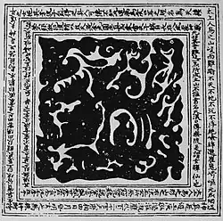 According to professor Shih-Shan Susan Huang (黃士珊) true form charts are deliberately designed to be incomprehensible for ordinary people as they are a part of the esoteric teachings of Taoism and can only be read by those who are trained to do so.[2] Taoist rituals have a prominent place in their visual culture and vice versa, with the more esoteric true form charts representing an "outer" ritual dimension that can transform the "inner" experiences.[15] On this Ge Hong commented that during the Eastern Wu dynasty a man by the name of Jie Xiang (介象) was able to read the talismanic script and tell whether it was authentic or inauthentic.[16] Ge Hong claimed that if someone attempted to test him by removing the captions from any therapeutic or apotropaic talisman that Jie Xiang could still tell what was written in them and that he was even able to correct some mistakes in them.[16] However, after Jie Xiang nobody has been able to read the talismanic script meaning that it was impossible to tell if they were right or wrong.[16]