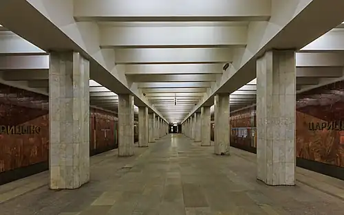 Tsaritsyno (Russian: Царицыно) is a Moscow Metro station in Tsaritsyno District, Southern Administrative Okrug, Moscow. It is on the Zamoskvoretskaya line, between Kantemirovskaya and Orekhovo stations. The entrance is located at the intersection of Luganskaya, Kaspiyskaya and Tovarishchesckaya ('Luhansk', 'Caspian', and 'Tovarishch' streets).[a]
