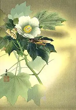 In the last ten years of the Meiji era, Kakō became preoccupied with the study of waves, his style breaking with tradition and becoming highly idiosyncratic. During this period Kakō also experimented with the use of colour. His lack of conformity adversely affected his popularity; even so his work came in for scrutiny and critical commentary in many contemporary articles.[1]
