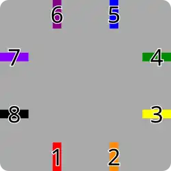 There are thirty-five possible permutations for a four-sided tile with two entry points per side and four paths linking the eight points.[2][3] In the table below, tiles are named according to the connected points. Points are numbered sequentially anti-clockwise from the left point on the bottom edge, so the bottom edge contains points 1 (left) and 2 (right), the right edge contains points 3 (lower) and 4 (upper), the top edge contains points 5 (right) and 6 (left), and the left edge contains points 7 (upper) and 8 (lower). The nomenclature AB-CD-EF-GH indicates that points A and B are connected, C and D are connected, E and F are connected, and G and H are connected. A single 90° rotation anti-clockwise will increment each number by 2 (modulo 8) to determine path connections when rotated.