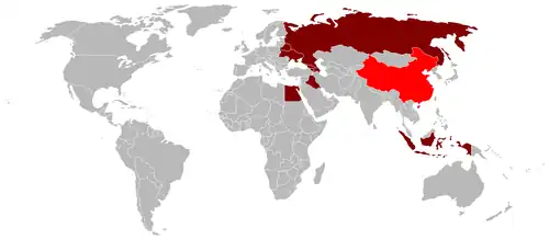 - Indonesian Air Force: 12 Tu-16, 12 Tu-16KS-1, and 2 Tu-16R. The first Tu-16 was delivered in 1961.[13] Used during the preparation of Operation Trikora in 1962 and during Indonesia–Malaysia confrontation in 1963–1966. The bomber and recon variant were operated by 41st Air Squadron, while the KS-1 was operated by 42nd Air Squadron. They were primarily based at Iswahjudi Air Force Base in Madiun, East Java.[13] They were grounded in 1969 and removed from service in 1970.[10]