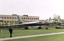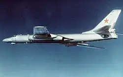 The Tupolev Tu-16 (USAF/DOD reporting name Type 39;[2] NATO reporting name: Badger)[3] is a twin-engined jet strategic heavy bomber used by the Soviet Union. It has been flown for almost 70 years. While many aircraft in Soviet service were retired after the Cold War ended, the Chinese license-built version Xian H-6 remains in service with the People's Liberation Army Air Force, with the most modern variant, the H-6K, still being actively produced as of 2020.[4]