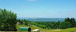 The valley is traversed by the Tualatin River and is bordered on the north and east by the Tualatin Mountains, a spur of the Northern Oregon Coast Range.[2] The latter range also comprises the valley's western border. To the south lie the Chehalem Mountains, separating the region from the main Willamette Valley.[2] The Tualatin River flows mainly from the west to the east and leaves the valley in the southeast at West Linn in Clackamas County. Tualatin Valley's geographical center is located southeast of Hillsboro, and the general elevation of the valley is 180 feet (55 m) above sea-level.[1]