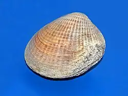 | One valve of a shell of Tucetona laticostata from New Zealand, on display at the Museo Civico di Storia Naturale di Milano | |