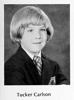 Carlson was briefly enrolled at Collège du Léman, a boarding school in the Canton of Geneva in French-speaking Switzerland, but said he was "kicked out".[86] He attained his secondary education at St. George's School, a boarding school in Middletown, Rhode Island, where he started dating his future wife, Susan Andrews, the headmaster's daughter.[87] He then spent four years attending Trinity College in Hartford, Connecticut and graduated in 1991 with a B.A. in history.[88] Carlson's Trinity yearbook describes him as a member of the "Dan White Society", an apparent reference to the American political assassin who murdered San Francisco mayor George Moscone and supervisor Harvey Milk.[89][90][91] After college, Carlson tried to join the Central Intelligence Agency, but his application was denied, after which he decided to pursue a career in journalism with the encouragement of his father, who advised him that "they'll take anybody".[64][92]