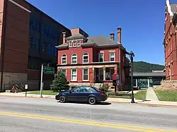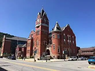 The Tucker County Courthouse and Jail in Parsons, West Virginia was built between 1898 and 1900 in a combination of Flemish Renaissance and Romanesque Revival styles. The red pressed-brick structure is flanked by a "jail and jailer's residence" built in 1896 in a similar style.[2]