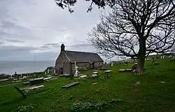Seeking a place to live out the religious life, Tudno went to the great ancient limestone outcrop of the Great Orme (Cyngreawdr), jutting from the Creuddyn Peninsula, to bring the message of Christianity to its people. He lived initially as a hermit in a small coastal cave with difficult access known as Ogof Llech, which provided protection from the elements, and a source of fresh water from a spring well Ffynnon Llech.[3] From this base he constructed a church. Nothing remains of this 6th century church building, although the present 12th century church, dedicated to St Tudno, stands on the same site, and has a continuous history.[4]