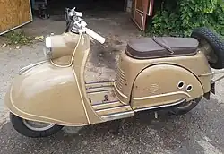 The documentation for the heavier scooter, named Tula T-200, was developed in cooperation with the Central Experimental Design Bureau in Serpukhov, which copied the powertrain, including the engine and electrical system.[4] Some changes were made to the original design, such as using a Soviet carburetor, with minimal differences in engine parameters.[a] The copied scooter was significantly heavier (over 150 kg compared to the original's 125 kg), so larger 10-inch tires were used instead of the 8-inch ones found on the basic Goggo model.[b][4] Early Goggo scooters had a distinctive fixed fender covering the entire front wheel, but the Tula received a fender with a shallow cutout at the bottom, similar to later models. Despite these changes, the Soviet scooter did not become direct competition because in 1956, Glas ceased scooter production to focus on microcars.[c]