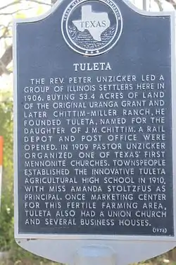 Tuleta was founded by Peter Unzicker, a Mennonite minister, who brought a colony of Mennonites from Cullom, Illinois, in 1906. Unzicker, a German, purchased 54.5 acres (22.1 ha) of land from the Chittim-Miller ranch for the townsite, which was named for J. M. Chittim's daughter. The San Antonio and Aransas Pass Railway was built across the ranch in 1881. The depot opened in Tuleta in 1906; the following year the post office opened. The Mennonite church, built that year, was used for school on weekdays. In 1910, Amanda Stoltzfus organized the Tuleta Agriculture High School, the first of its kind in Texas; its faculty came from such prestigious institutions as Smith College and the University of Wisconsin. Stoltzfus, the principal, offered instruction in sewing and cooking for girls and manual training and agriculture for boys. The school had dormitories for boarders.