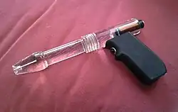 In 1976 Proni, a skilled machinist, began fabricating "ray guns" resembling the futuristic handguns in illustrations of science fiction stories. A typical "weapon"—decorative but not functional—was fashioned from polished, transparent acrylic plastic, which acted as a light pipe for a pulsating colored bulb. Batteries and electronics were concealed in opaque parts such as the handgrip. Some models featured audio circuits and speakers to produce an eerie warbling tone.
