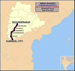 The Tungabhadra Express is an Express train in India which runs between Kurnool City in Andhra Pradesh and Secunderabad Jn in Telangana. This train is named after the River Tungabhadra. The Secunderabad Division of the South Central Railway division of the Indian Railways administers this train.