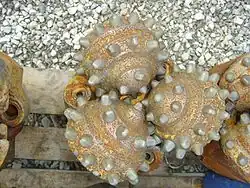 Tungsten carbide is used extensively in mining in top hammer rock drill bits, downhole hammers, roller-cutters, long wall plough chisels, long wall shearer picks, raiseboring reamers, and tunnel boring machines. In these applications it is also used for wear and corrosion resistant components in inlet control for well screens, sub-assemblies, seal rings and bushings common in oil and gas drilling.[39] It is generally utilised as a button insert, mounted in a surrounding matrix of steel that forms the substance of the bit. As the tungsten carbide button is worn away the softer steel matrix containing it is also worn away, exposing yet more button insert.