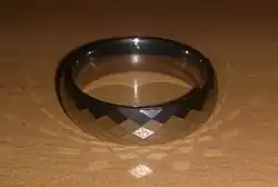 Tungsten carbide, typically in the form of a cemented carbide (carbide particles brazed together by metal), has become a popular material in the bridal jewelry industry due to its extreme hardness and high resistance to scratching.[49][50] Even with high-impact resistance, this extreme hardness also means that it can occasionally be shattered.[51] Some consider this useful, since an impact would shatter a tungsten ring, quickly removing it, where precious metals would bend flat and require cutting. Tungsten carbide is roughly 10 times harder than 18 k gold. In addition to its design and high polish, part of its attraction to consumers is its technical nature.[49] Special tools, such as locking pliers, may be required if such a ring must be removed quickly (e.g. due to medical emergency following a hand injury accompanied by swelling).[52]