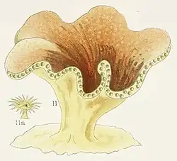 It was described as Gemmipora patula by James Dwight Dana in 1846. Synonyms include Gemmipora patula, Turbinaria bankae, Turbinaria cupula, Turbinaria fungiformis, and Turbinaria robusta.[2]