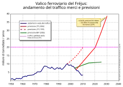 The following table summarizes 2007 predictions (in million tons per year) of the future freight traffic on both the Frejus and Mont-Blanc corridors, from an analysis of then current data and macroeconomic predictions:[31]