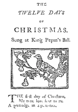 "The Twelve Days of Christmas" is an English Christmas carol and nursery rhyme. A classic example of a cumulative song, the lyrics detail a series of increasingly numerous gifts given to the speaker by their "true love" on each of the twelve days of Christmas (the twelve days that make up the Christmas season, starting with Christmas Day).[3][4] The carol, whose words were first published in England in the late eighteenth century, has a Roud Folk Song Index number of 68. A large number of different melodies have been associated with the song, of which the best known is derived from a 1909 arrangement of a traditional folk melody by English composer Frederic Austin.