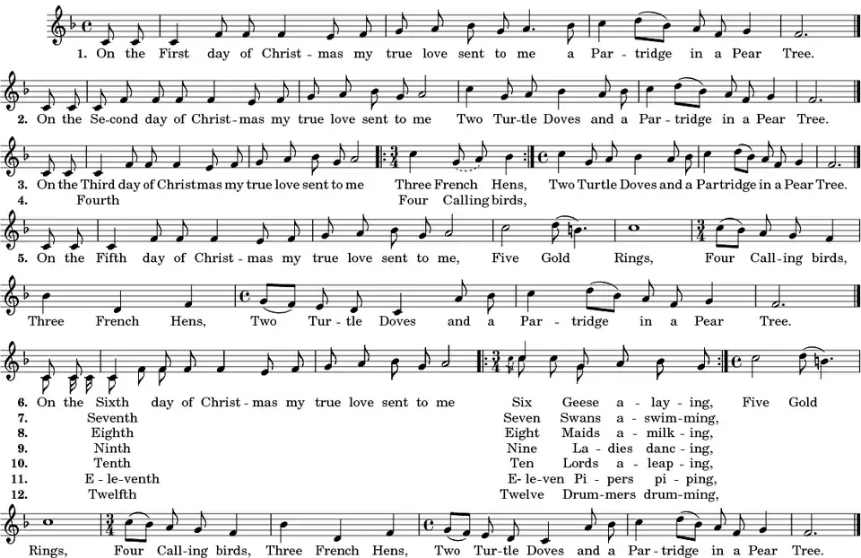 "The Twelve Days of Christmas" is a cumulative song, meaning that each verse is built on top of the previous verses. There are twelve verses, each describing a gift given by "my true love" on one of the twelve days of Christmas. There are many variations in the lyrics. The lyrics given here are from Frederic Austin's 1909 publication that established the current form of the carol.[5] The first three verses run, in full, as follows: