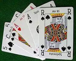Twenty-five is the Irish national card game, which also underlies the Canadian game of Forty-fives. Charles Cotton describes its ancestor in 1674 as "Five Cards", and gives the nickname five fingers to the Five of Trumps extracted from the fact that the Irish word cúig means both 'five' and 'trick'.[1] It is supposed to be of great antiquity, and widely believed to have originated in Ireland, although "its venerable ancestor", Maw,[2] of which James I of England was very fond, is a Scottish game.[3]