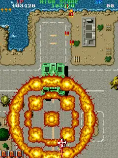 Depending on the region, the title uses either a checkpoint system in which a downed single player will start off at the beginning of the checkpoint they managed to reach before dying, or a respawn system where their ship immediately starts at the location they died at.[9] Getting hit by enemy fire or colliding against enemies will result in losing a life, as well as a penalty of decreasing the helicopter's firepower to his original state and once all lives are lost, the game is over unless the players insert more credits into the arcade machine to continue playing.[7][8] After completing the last stage as with previous titles from Toaplan, the game begins again with the second loop increasing in difficulty and enemies fire denser bullet patterns.[9]