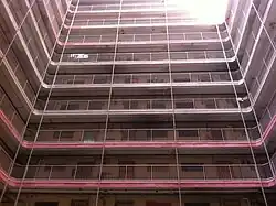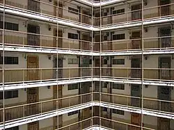 The first Twin Tower blocks appeared at Wah Fu Estate. They were suited to the steeply sloping site, as one of the two "towers" within each block is offset by three storeys from the other, providing ground level entrances at multiple points along the slope. The two central atria in each block measure 50 by 50 feet.[3] Reportedly, the square shape of the twin tower design provided the structural stability necessary to build more floors than the earlier, narrower slab blocks.[4]