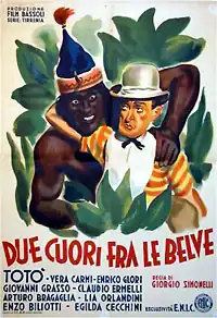 Two Hearts Among the Beasts (Italian: Due cuori fra le belve) is a 1943 Italian comedy film directed by Giorgio Simonelli and starring Totò, Vera Carmi and Enrico Glori.[1] A dancing master takes part in an expedition to Africa find a missing anthropologist whose daughter he is in love with.