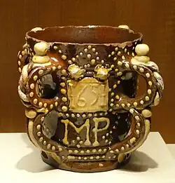 The term 'frilly-based tyg' is used in some English archaeological literature[4] to refer to a type of medieval and early post-medieval drinking mug or pitcher, usually wheel-thrown with a rounded belly and a straight or flared neck, which may have one or more handles. The 'frilly base' refers to the foot-ring of the mug, which after throwing was given an alternating bossed and indented form by manual shaping with fingers or thumbs. This style was popularized from c. 1300 onwards in hard-fired Rhenish wares, for example in ash-glazed wares from Siegburg, near Bonn, Germany,[5] and later in salt-glazed wares like those from Raeren, eastern Belgium.[6] These were imported to England in large quantities and were imitated in English stoneware and earthenware.