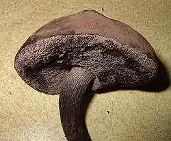 The shape of the cap is initially convex before later becoming broadly convex to eventually flattened in maturity; the diameter of the cap is typically between 3 and 15 cm (1+1⁄4 and 6 in). The cap surface is dry, with a velvet-like texture, although in age it can become rimose (developing a network of cracks and small crevices). The cap color is initially black to dark grayish brown; young specimens can have a whitish bloom (resembling a dusting of fine powder) on the surface.[17] Fruit bodies, especially young specimens, tend to be free of maggots and other insect larvae.[18] As the mushroom matures, the bloom disappears and the color fades to become grayish to grayish brown.[18] The cap flesh is whitish, but after it is cut or injured, it will stain pink to reddish gray, and eventually turn black.[17]