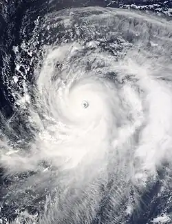 At 1800 UTC on August 20, the JMA upgraded Chaba to typhoon status,[2] while the system was roughly 345 km (214 mi) east-southeast of Saipan.[1] Much of the rapid intensification pattern was attributed to the development of dual outflow channels during the day's course. Concurrently Chaba began to curve towards the northwest around the periphery of the nearby, dominant subtropical ridge in response to an approaching longwave,[3] sweeping past the Mariana Islands.[1] At 1800 UTC on August 23, the JMA assessed the typhoon to have reached its peak intensity with maximum sustained winds of 205 km/h (127 mph) and a minimum barometric pressure of 910 mbar (hPa; 26.87 inHg).[2] An intense albeit average-sized typhoon, Chaba held this intensity for two days before dry air began to impact the cyclone. On August 26, the typhoon's convection slightly weakened, and the more intense convective activity became limited to the southern and eastern sides of the system.[1]