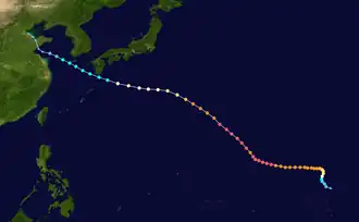 Typhoon Fengshen was the strongest storm of the 2002 Pacific typhoon season.[1] It developed on July 13 from the monsoon trough near the Marshall Islands, and quickly intensified due to its small size. By July 15, Fengshen attained typhoon status, and after initially moving to the north, it turned toward the northwest. On July 18, the typhoon reached its peak intensity of 185 km/h (115 mph 10‑minute winds), according to the Japan Meteorological Agency. The Joint Typhoon Warning Center estimated peak winds of 270 km/h (165 mph 1‑minute winds), and the agency estimated that Fengshen was a super typhoon for five days. This broke the record for longest duration at that intensity, previously set by Typhoon Joan in 1997, and which was later tied by Typhoon Ioke in 2006.