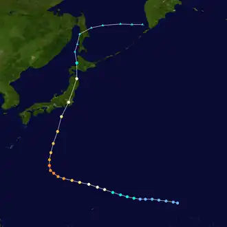 At around 1100 UTC on October 1, Higos passed just east of the Miura Peninsula with winds of 130 km/h (81 mph), about 30 minutes before making landfall in the eastern portion of Kanagawa Prefecture near Yokosuka.[4] Higos passed very near Tokyo around 1200 UTC that day,[3] becoming the third strongest typhoon to affect the city since World War II, according to the JTWC.[2] The typhoon weakened into a tropical storm while crossing Honshu. Higos briefly emerged over waters, before making a second landfall on Tomakomai, Hokkaidō at 2100 UTC on October 1. By that time, the storm was beginning to transition into an extratropical cyclone, and at 0600 UTC on October 2 Higos completed the transition.[4] Simultaneously, the JTWC discontinued advisories.[2] The storm continued to the north before crossing Sakhalin. The remnants dissipated on October 4 just west of the Kamchatka Peninsula.[4]