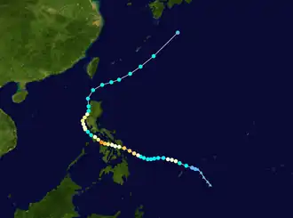 Severe damage took place across the Philippines, with Leyte suffering the brunt of Irma's impact.[2] Twenty people lost their lives across the country.[3] Preliminary reports indicated that Tacloban incurred $2.5 million in damage.[2] A gasoline explosion near Manila that killed 12 people and injured 18 others was partially attributed to the typhoon.[4] On May 17, the 740 ton vessel Pioneer Cebu sailed directly into the storm over the Visayan Sea off the coast of Malapascua Island after ignoring warnings to remain at port. Carrying 262 people, the ship struck a reef while battling rough seas in the typhoon.[2] Passengers began abandoning the sinking vessel soon thereafter under the captain's orders while message about the ship's sinking was relayed by the radio operator. A large wave then struck the ship on its side, capsizing and submerging it entirely. Of the passengers and crew, 122 went down with the ship, including captain Floro Yap, while 140 managed to escape.[5][6] Rescue operations lasted nearly two days, with many of the survivors being stranded in shark infested waters for upwards of 40 hours.[6] Of the survivors, 130 were picked up by a rescue ship while 10 others were found on nearby islands.[5] Only five bodies were recovered in the area while the rest were presumed to be lost with the ship in an area referred to as the "graveyard of ships."[6] A trading vessel, the Banca Alex, also sank off the coast of Cebu with 80 people aboard; 60 were later rescued while 20 others were never found.[7]