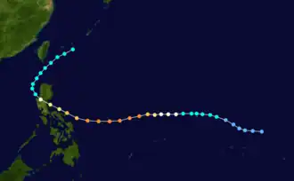 Irma maintained super typhoon intensity for 16 hours before gradually weakening due to the storm's close proximity to the mountainous terrain of the Philippines. After turning northwest towards a break within the subtropical ridge, Irma moved ashore around 0900 UTC on November 24, roughly 100 km (60 mi) northeast of Manila.[1] At the time of landfall, both agencies estimated winds of 160 km/h (100 mph), equal to Category 2 intensity on the SSHWS.[4] Although the JTWC downgraded Irma to a tropical storm that afternoon just before entering Lingayen Gulf and the South China Sea,[1] the JMA maintained Irma at typhoon intensity throughout the storm's passage of the Philippines.[2] Ten hours later, a Hurricane Hunter aircraft investigated Irma and noted that Irma was poorly organized, with most of the convection sheared off to the north of the center. Influenced by a trough east of Asia, Irma began to re-curve into the Luzon Straits on November 25.[1] Around this time, the JMA downgraded Irma into a severe tropical storm. Early on November 26, the JMA reported that Irma had transitioned into an extratropical cyclone.[2] About 24 hours later, Irma merged with a cold front in the Ryukyu Islands.[1] On the evening of November 27, both PAGASA and the JMA ceased monitoring Irma.[2][7]