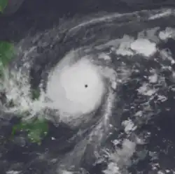 On the morning of November 19, a Hurricane Hunter aircraft reported winds of 55 km/h (35 mph), prompting the JTWC to classify the system as a tropical depression.[1] After passing north of Guam, Irma was upgraded into a tropical storm by both agencies.[4][nb 3] Around this time, the JTWC expected that Irma would pass south of a front and then turn southwest.[1] Tropical Storm Irma began to deepen more rapidly, and on November 20, the JMA upgraded Irma into a severe tropical storm.[2] Thereafter, Irma turned west as a subtropical ridge built north and northwest of the storm, which protected Irma from feeling the effects of strong wind shear.[1] At 1800 UTC on November 20, the JTWC upgraded Irma into a typhoon.[4] Later that evening, a Hurricane Hunter aircraft reported winds of 160 km/h (100 mph) and a pressure of 968 mbar (28.6 inHg).[1] Following the formation of a 74 km (46 mi) eye,[1] the JMA declared that Irma attained typhoon status at 0000 UTC on November 21;[2] subsequently, the system passed south of a second cold front. By 0900 UTC that day, rapid deepening to pressures below 925 mbar (27.3 inHg) was anticipated by the JTWC.[1] At 1800 UTC on November 21, the JMA raised the intensity of the typhoon to 175 km/h (110 mph)[2] while the JTWC reported that Irma reached winds of 200 km/h (125 mph), equivalent to a Category 3 hurricane on the United States-based Saffir-Simpson Hurricane Wind Scale (SSHWS). Midday on November 22, a Hurricane Hunter airplane reported a pressure of 905 mbar (25 inHg). Based on this the JTWC upgraded Irma into a super typhoon.[1] Meanwhile, data from both the JTWC and JMA suggested that Irma reached its peak intensity, with the former reporting winds of 250 km/h (155 mph) and the latter reporting winds of 200 km/h (125 mph).[4] On that day, the Philippine Atmospheric, Geophysical and Astronomical Services Administration (PAGASA) also started to monitor the storm and assigned it with the local name Anding.[6][7]