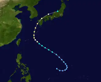 The depression initially tracked northwest due to a weak subtropical ridge to its north.[1] At 00:00 UTC on September 11, the JTWC upgraded the depression into Tropical Storm Kinna,[5] with the JMA doing the same later that morning.[6][nb 2] At 18:00 UTC, the JMA classified Kinna as a severe tropical storm.[2] The development of a poorly defined eye within a central dense overcast prompted the JTWC to upgrade Kinna into a typhoon on the morning of September 12,[1] although the JMA did not follow suit until 18:00 UTC.[6] Also on September 12, a mid-tropospheric trough deepened over the East China Sea, which split the ridge near 125th meridian east. In response, Typhoon Kinna turned northward toward the break in the ridge and tracked across Okinawa. Shortly after becoming a typhoon, the eye crossed densely populated southern Okinawa.[1] At 00:00 UTC on September 13, the JTWC and JMA estimated that Kinna attained peak winds of 170 and 145 km/h (105 and 90 mph), with the latter estimating a minimum barometric pressure of 955 mbar (28.2 inHg).[2] After recurvature, Kinna accelerated north-northeastward toward Kyushu as it maintained its intensity. Later on September 13, the typhoon's eyewall passed over the cities of Nagasaki and Sasebo on Kyushu. Kinna rapidly lost tropical characteristics as it tracked along the northern coast of Honshu.[1] The JMA declared Kinna an extratropical cyclone early on September 14,[6] with the JTWC doing the same several hours later.[1] Its extratropical remnants were last witnessed on the evening of September 16 by the JMA.[6]