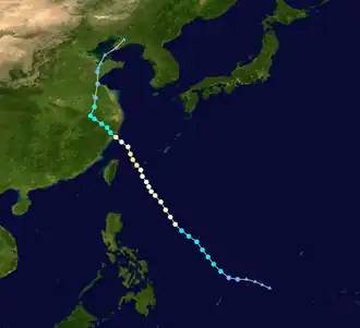 Tropical Storm Matsa gradually intensified as it tracked steadily northwestward; by late on August 1 it strengthened into a severe tropical storm. Outflow and deep convection to the north remained limited, though the storm was able to intensity further to attain typhoon status on August 2 about 780 km (480 mi) south of Okinawa. Intensification slowed, and late on August 3 Matsa reached a peak intensity of 150 km/h (93 mph) while located 495 km (308 mi) east of the southern tip of Taiwan as reported by the JMA; the JTWC and the National Meteorological Center of China reported the typhoon as strengthening further to attain peak winds of 165 km/h (103 mph) on August 4. Shortly after passing over the Japanese island of Ishigaki, Matsa began to weaken steadily as it approached the coast of China, and made landfall as a minimal typhoon late on August 5 near Yuhuan in the southern region of Zhejiang Province. It crossed the Gulf of Yueqing and 40 minutes after its first landfall it struck Mainland China near Yueqing. It quickly weakened to a tropical storm, and within hours of moving ashore the JTWC issued its last advisory. Matsa turned to the north, weakening to a tropical depression on August 7 shortly before entering the Yellow Sea. The weakening depression continued northward, and became an extratropical cyclone on August 9 after hitting the Liaodong Peninsula.[1][2][3]