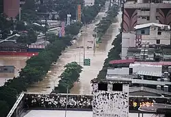 Striking two months after Taiwan's second deadliest typhoon, Toraji, Nari brought torrential rainfall to much of the island. Numerous landslides triggered by the storm's rain destroyed homes and buried people. At least 94 people died on the island and ten others were missing. Agricultural losses from Nari were estimated at NT$2.9 billion (US$84 million).[1] In mountainous regions, more than 1,225 mm (48.2 in) of rain fell over two days, leading to many rivers overflowing their banks. On 17 September, some areas recorded a record-breaking 800 mm (31 in) during a single day, equivalent to four months of rain in Taiwan. At the height of the storm, an estimated 650,000 people were without power and 350,000 lost their water and telephone service. Most of the fatalities took place around the city of Taipei and nearby counties. The metro system in the city was severely damaged by floods and was not expected to be working for at least six months.[2]
