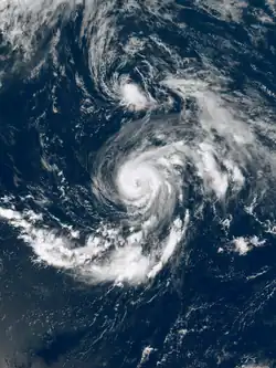 Noru struggled to intensify significantly for two days owing to relatively low ocean heat content values and its asymmetric structure,[12] until it developed into a severe tropical storm at around 18:00 UTC on July 22.[5] Subsequently, Noru slowed down and remained stationary, due to a complex steering environment consisting of ridging on three sides. The steering flow also transitioned from a subtropical ridging to the west to a near equatorial ridge to the south of the system. Noru rapidly intensified into the first typhoon of 2017 around 12:00 UTC on July 23,[13] marking the latest occurrence of the first typhoon since 1998.[14] It featured a 20 km (12 mi) diameter pinhole eye that embedded in an extremely compact core located about 900 km (560 mi) east of the Bonin Islands, thanks to moderate eastward outflow, anomalously warm SSTs and low vertical wind shear.[15] After that, the eye repeatedly reappeared and filled due to increasing vertical wind shear offset by improving poleward outflow into the upper-low associated with Tropical Storm Kulap. Noru also started to track east-southeastward under the steering influence of a near equatorial ridge to the south.[16][17]
