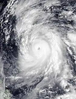 On September 14, Sanba showed signs of undergoing an eyewall replacement cycle, as concentric rings were seen in microwave imagery.[15] It later weakened into a Category 4-equivalent typhoon at 15:00 UTC that same day, due to wind shear increasing once again as it continued northward.[16] By the next day, it further weakened into a Category 3-equivalent typhoon, as dry air had started to encircle the system while it redeveloped its eye.[17] A 25 nmi (46 km) eye soon reappeared on satellite imagery, with the subtropical jet stream enhancing its poleward outflow as it turned to the north-northwest under the influence of a deep-layered subtropical ridge positioned to the east of Japan.[18] Sanba later exited the Philippine Area of Responsibility, with the PAGASA issuing its last advisory on the storm.[19]