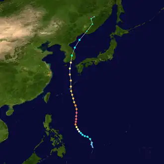 Passing just to the west of Japan, Sanba caused extensive losses to agriculture, forestry, and fishing industries on the islands of Okinawa Prefecture. Further inland on Kōchi and Gifu Prefectures, heavy rains damaged agricultural regions and washed out numerous roads. Losses on both prefectures totalled to ¥2.5 billion (US$31.8 million).[nb 2] Upon its landfall on the Korean Peninsula on September 17, it became the first time in 50 years that the peninsula had been struck by at least four typhoons in a single year.[1] In South Korea, torrential rainfall also washed out road systems and inundated crop land, as well as damaged infrastructure. Losses there associated with Sanba totaled to ₩365.7 billion (US$328 million). In North Korea, the heavy precipitation worsened preexisting flood conditions initially started by Tropical Storm Khanun two months prior. In all, the typhoon killed six people and caused US$361 million in losses.