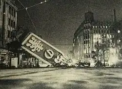 The storm broke all telephone lines from the areas of Tokyo, Osaka, Kobe, and Kyoto. 281 bridges were washed out and 21 railroads were dismantled.[15] In addition, all flights from Japan were cancelled by the storm.[16] The number of people killed by Tess was 393, while 85 were missing.[1][3] Japan suffered some large-scale disasters with more than 1,000 of casualties. When compared to the June 1953 North Kyushu flood and Wakayama flood, the damage caused by Typhoon Tess was relatively mild but still destructive, with 86,398 houses are destroyed, 495,875 flooded houses, 318,657 hectares of damaged agricultural fields and 5,582 damaged ships.[3] 6,000 people had also been evacuated, with 167 people injured, and 180 missing on September 28.[17] When the storm hit Kyoto, the storm deeply affected agricultural farming in the region. Ending with 55.6 million Japanese Yen (1953) (US$386,000).[18]