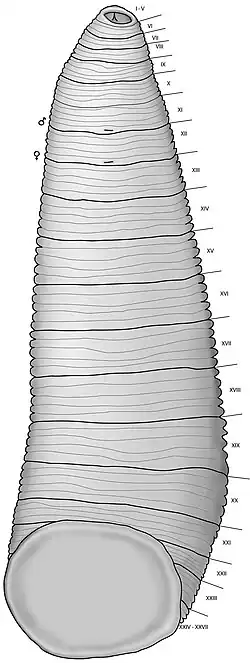 External anatomy of Tyrannobdella rex. Whole body ventral view illustrating annulation, relative size of the caudal sucker, and relative position of gonopores.