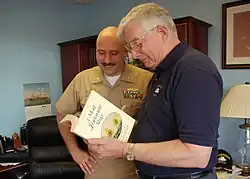 ![]() Martin (right) autographs a copy of A Most Fortunate Ship for Commander William A. Bullard III, May 2007 | |