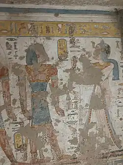 The decorations or the side chambers include netherworld gods, images of Canopic chests and the Souls of Pe and Nekhen. One of the side chambers also includes a scene showing the Queen as a (male) Iunmutef priest. In the inner chamber the Queen again appears before several deities. The rear wall contains a scene depicting Osiris. He is seated on a throne and assisted by Thoth, Nephthys, Neith and Serket.[8]